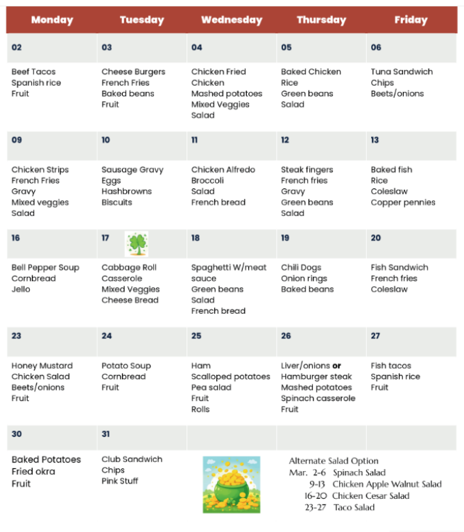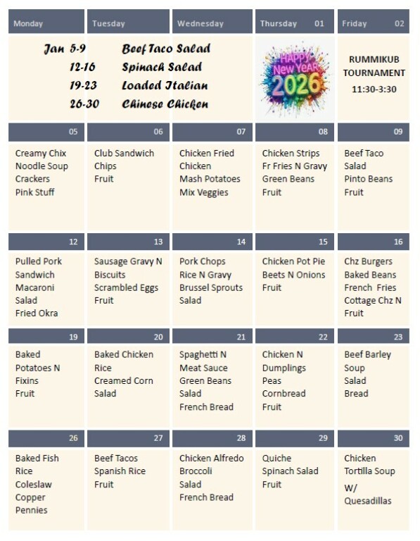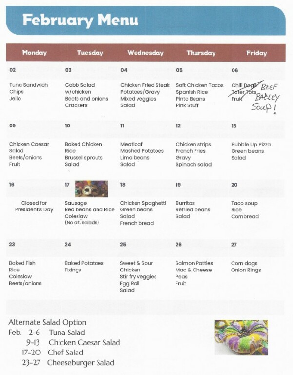 Lunch meals are available for pickup or dining at center. Space is limited so you must make a reservation when you call in for lunch.